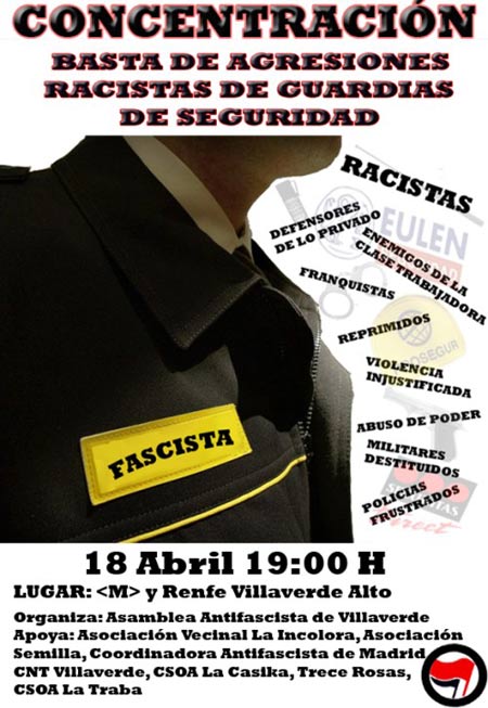 La seguridad privada, especialmente por esa misma condición de guardianes de lo privado y con su constante actitud chulesca y despreciativa, heredada de las fuerzas y cuerpos de seguridad del estado pero aumentada al tener menos control institucional, se convierte en un instrumento de represión aleatoria, especialmente incisiva para con inmigrantes y jóvenes solidarios/as. Cualquiera puede ser el siguiente en verse afectad@