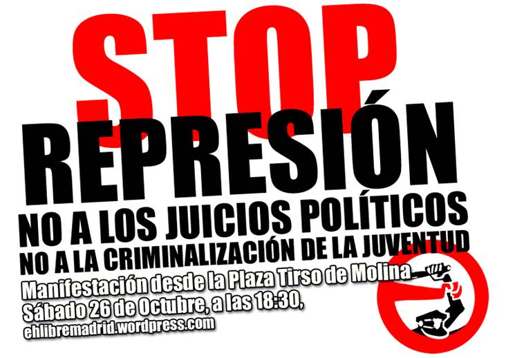 Por todo ello, por las y los compañeros vascos, por la gente que lucha a lo largo y ancho del Estado español, o simplemente por quienes defiendan el derecho a la lucha y la protesta, llamamos el 26 de Octubre a salir a la calle y gritar ¡STOP REPRESIÓN! ¡NO A LOS JUICIOS POLÍTICOS! ¡NO A LA CRIMINALIZACIÓN DE LA JUVENTUD!