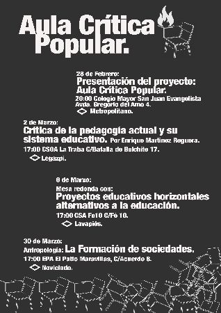El Aula Crítica Popular es un proyecto de autoformación en el que buscamos aprender de forma horizontal, participativa y abierta a todxs; donde podamos desarrollar una conciencia crítica y creativa, alejándonos de la presión de la búsqueda de resultados y centrándonos en la reflexión, para que cada cual encuentre sus propias respuestas.