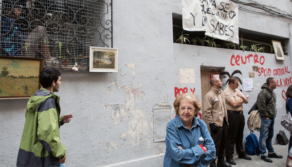 Una mujer mayor pasea a su perro y se para a preguntar qué está pasando estos días, que ve mucho ajetreo en la calle. Los jóvenes le comentan que “un grupo de matones neonazis están tratando de echar a la gente que vive en esa casa”. Ella se muestra sorprendida cuando le dicen que es una vivienda ocupada. “La próxima vez que pase por aquí os saludaré”, se despide tras una breve conversación.
