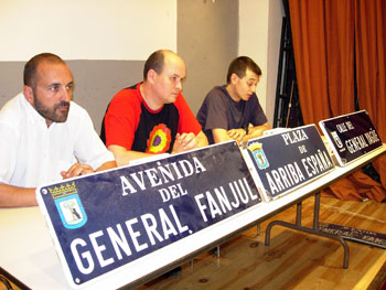 La Coordinadora Antifascista de Madrid, Corriente Roja y la Federación Estatal de Foros por la Memoria, exhibieron ayer en rueda de prensa las placas fascistas 'Avenida del General Fanjul?, 'Plaza de Arriba España' y 'Calle del General Yagüe', retiradas de las calles por estas organizaciones para denunciar la complicidad de las instituciones con el franquismo.