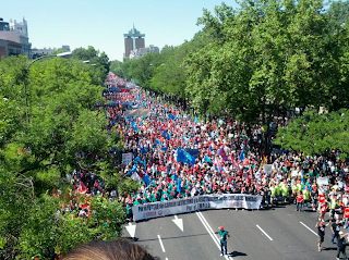 20.00: Atocha. Miles de personas participan en la manifestación convocada por la plataforma Hay Que Pararles Los Pies bajo el lema "Madrid obrero apoya a los mineros", que en estos momentos pasa por delante del Instituto Nacional de Administración Pública. La marcha está rodeada por un cordón de antidisturbios, si bien no llevan los cascos puestos. Una pancarta negra, entre muchas otras, exclama "por los derechos adquiridos ni un paso atrás".