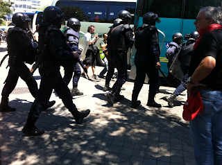 14.33, Pravda Estado español: Fuentes sindicales aseguran que los antidisturbios les impiden acceder a los autocares. Mientras, la manifestación ha sido disuelta tras varias cargas policiales, pero aún hay mucha gente por la zona. Los antidisturbios están incluso entre los autobuses de los solidarios que han llegado de toda España. Nuevo detenido. Informan de cargas policiales también en calle Orense.