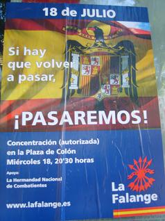 "Conmemoración de la Memoria Histórica" es el lema oficial, aunque el escudo franquista y la consigna "Si hay que volver a pasar, pasaremos" con la que se anuncia la concentración en los carteles dan claramente una idea de las intenciones de estos desalmados. Es la primera vez en muchos años que la extrema derecha se atreve a convocar una manifestación oficial para conmemorar aquel fatídico día de 1936 en que algunos generales, erigidos en brazo armado del fascismo patrio, se sublevaron contra el sistema democrático de la II República dando un golpe de Estado que llevaría a la mayor escabechina conocida en las Españas.