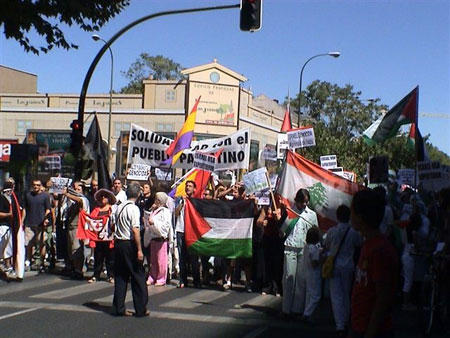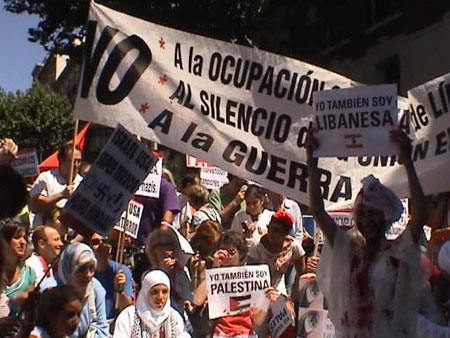 Cerca de un millar de personas se manifestaron ayer en Madrid contra la ocupación y la agresión a Líbano y Palestina por parte del régimen de Israel. La movilización, convocada por diversas ONGs, asociaciones de solidaridad con Palestina y algunas organizaciones políticas y antiguerra, dio comienzo pasadas las 12 del mediodía con una concentración frente a la embajada del régimen de Israel en la calle Velázquez 150, donde se lanzaron gritos de "esa embajada, está ensangrentada" y "cuantos más váis a matar".