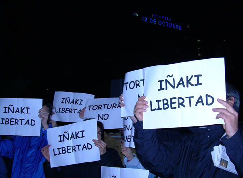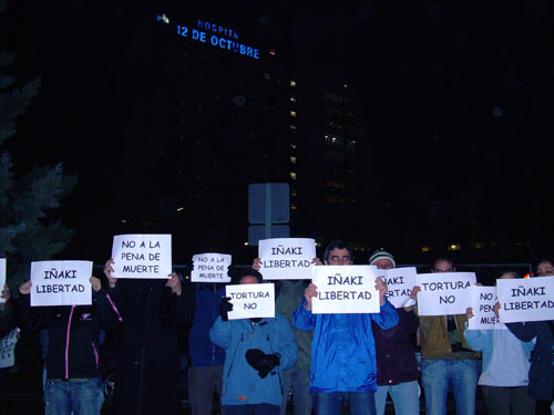 Hacia las 19.30 de la tarde de ayer, una treintena de ciudadanos de Madrid realizaron una concentración simbólica frente al Hospital 12 de Octubre, en un gesto de solidaridad con el preso político vasco Iñaki de Juana Chaos.
